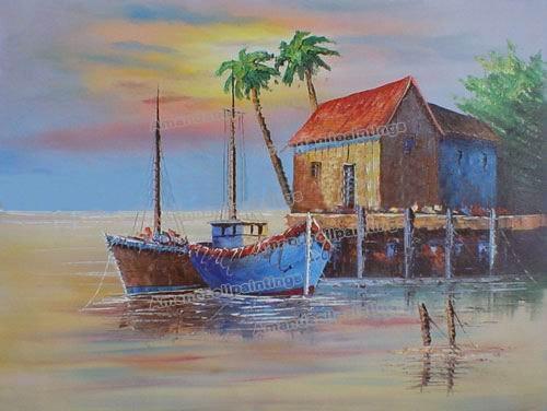 A House & A Ship Canvas Colourful Background Seascape Oil Paintings |
