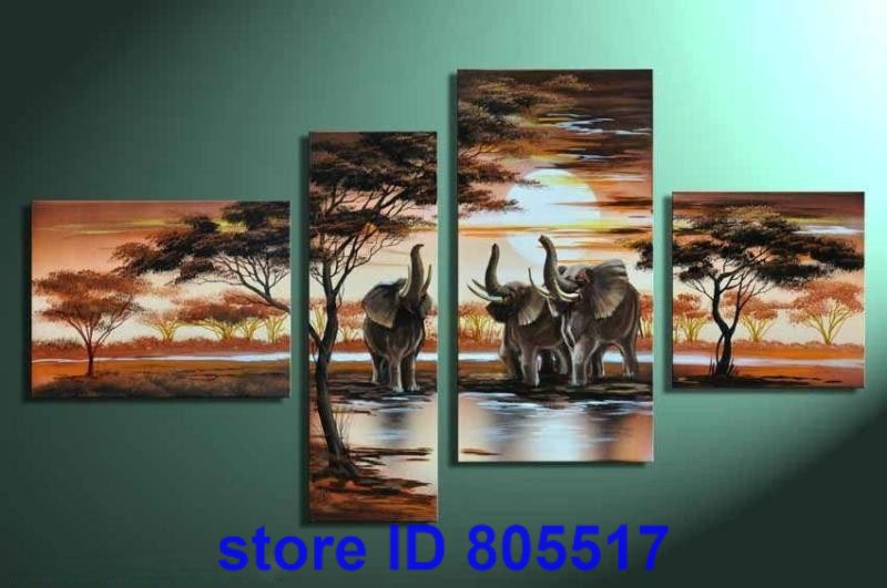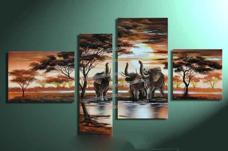 Dusk Background Elephants & Trees & River Subject Canvas Abstract Oil Paintings |