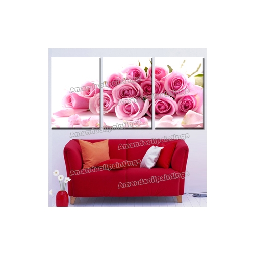 Framed Pink Rose Subject Triptych Landscape Oil Paintings |