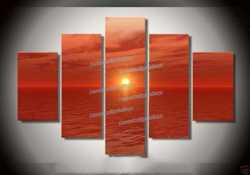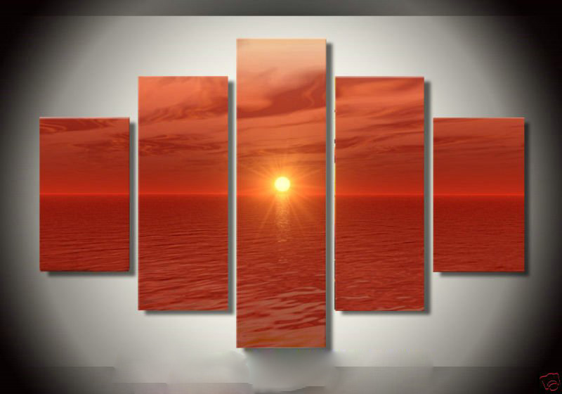Red Background Sea & Sun Subject Rectangle Shape Modern Oil Paintings |